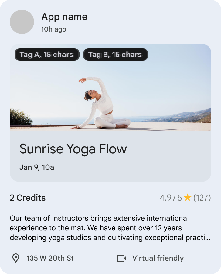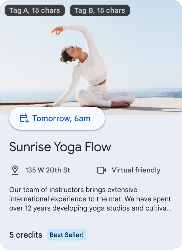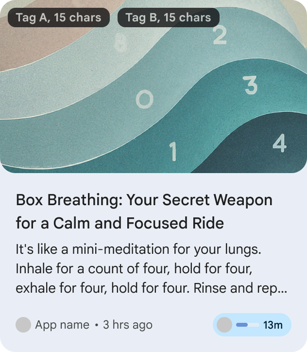 • ArticleEntity : ArticleEntity یک توصیه برای محتوای متنی است که با سلامتی و تناسب اندام مرتبط است. این موجودیت می تواند برای نشان دادن مقالات خبری ناتمام یا سایر محتوایی که کاربر مایل است از جایی که آن را ترک کرده است به مصرف خود ادامه دهد، استفاده شود. مثال: قطعه خبری، قطعه پست وبلاگ درباره موضوعات مرتبط با سلامتی یا تناسب اندام.
