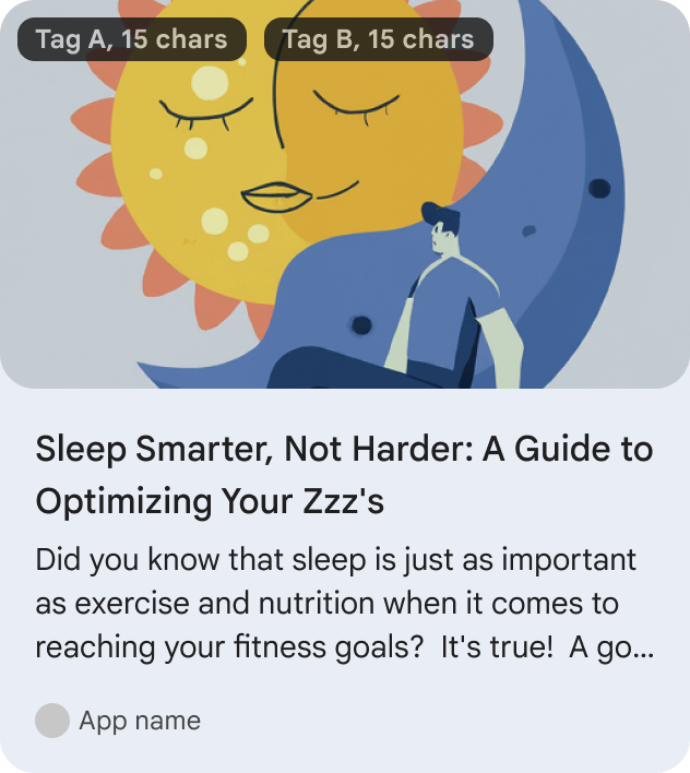 ArticleEntity: representa uma recomendação de conteúdo de texto relacionado a saúde e fitness. Ele pode ser usado para artigos, postagens de blog, conteúdo de marketing, trechos de notícias etc.