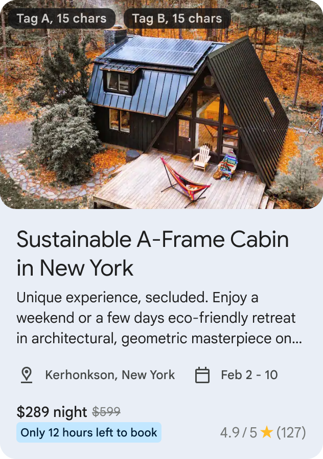 চিত্র 2: UI সুপারিশ ক্লাস্টারের মধ্যে একটি একক EventEntity দেখাচ্ছে৷ LodgingEntity : LodgingEntity একটি আবাসনের প্রতিনিধিত্ব করে, যেমন একটি হোটেল, অ্যাপার্টমেন্ট, স্বল্পমেয়াদী এবং দীর্ঘমেয়াদী ভাড়ার জন্য ছুটির বাড়ি।