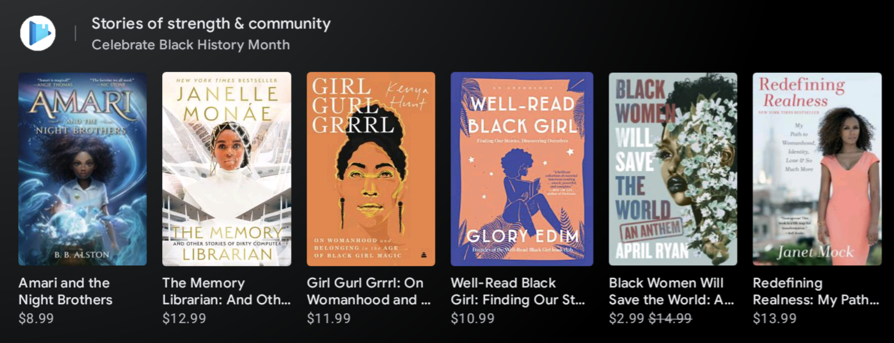 Figura 1. Interface do Entertainment Space mostrando um cluster de recomendação de um único parceiro. Entidade: um objeto que representa um único item em um cluster. Uma entidade pode ser um e-book, um audiolivro, uma série de livros e muito mais. Consulte a seção Fornecer dados da entidade para conferir uma lista dos tipos de entidade aceitas.