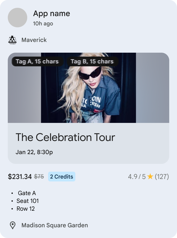 الشكل 2: واجهة مستخدم تعرض EventEntity واحدًا ضمن مجموعة الاقتراحات. LodgingEntity: يمثّل هذا النوع من الكيانات مكان إقامة، مثل فندق أو شقة أو منزل عطلات مخصّص للاستئجار لفترات قصيرة أو طويلة.