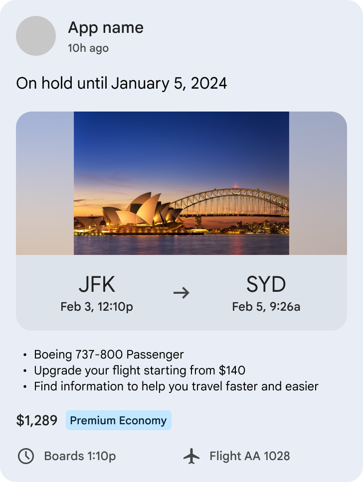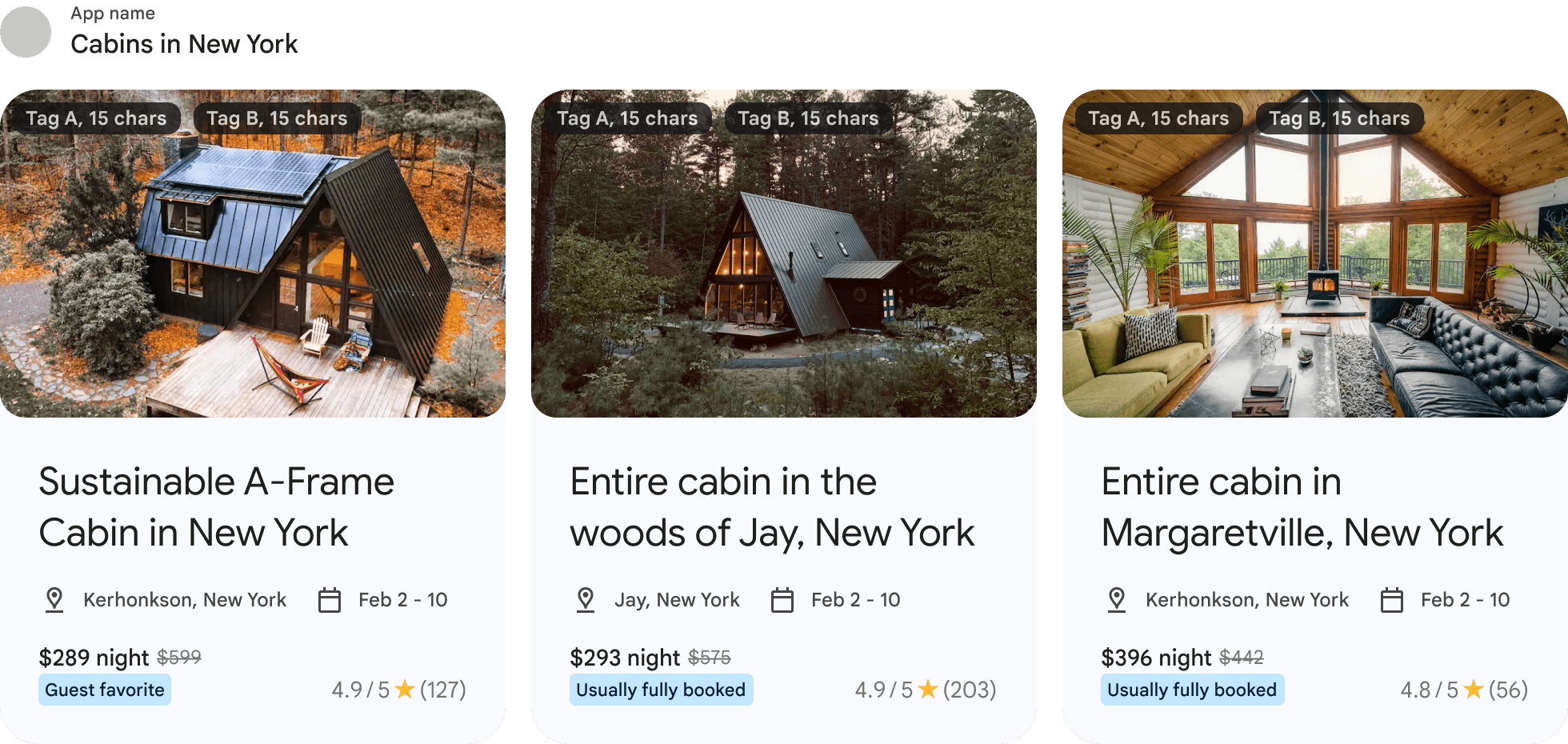 تعرض مجموعات الاقتراحات اقتراحات مخصّصة حول السفر والفعاليات من أحد شركاء المطوّرين. ويمكن أن تكون هذه الاقتراحات مخصّصة للمستخدم أو عامة (مثل المنتجات الرائجة). يمكنك استخدامها لعرض اقتراحات بشأن المقالات أو الأحداث أو أماكن الإقامة أو الأماكن التي تهمّك.