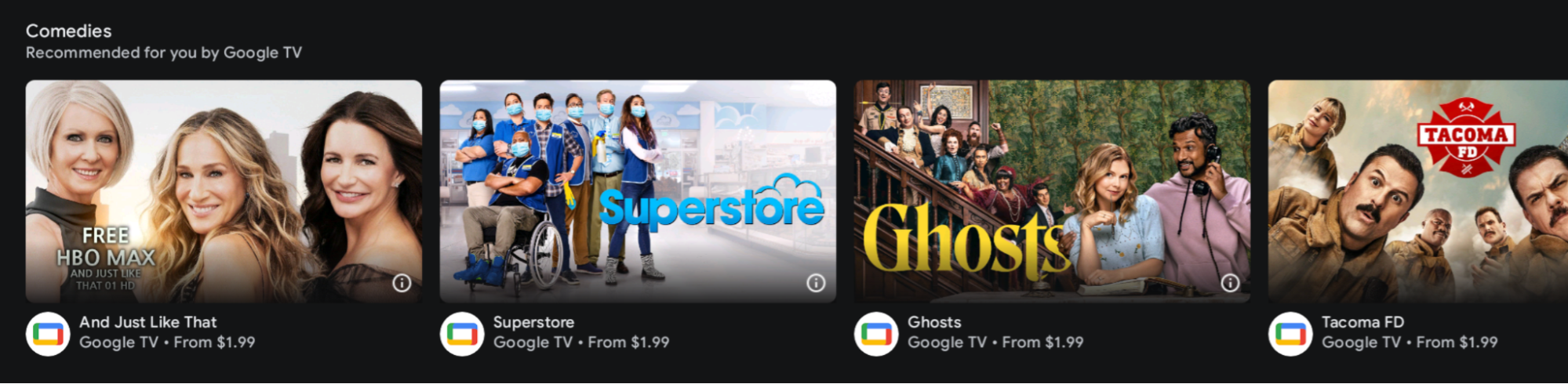 Figura 1. Interface do Entertainment Space mostrando um cluster de recomendação de um único parceiro. Entidade: um objeto que representa um único item em um cluster. Uma entidade pode ser um filme, um programa de TV, uma série de TV, um vídeo ao vivo e muito mais. Consulte a seção Fornecer dados da entidade para conferir uma lista dos tipos de entidade aceitas.