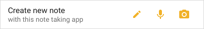 fun createSliceWithActionInHeader(sliceUri: Uri): Slice { // Construct our slice actions. val noteAction = SliceAction.create( takeNoteIntent, IconCompat.createWithResource(context, R.drawable.ic_pencil), ICON_IMAGE, "Take note" ) val voiceNoteAction = SliceAction.create( voiceNoteIntent, IconCompat.createWithResource(context, R.drawable.ic_mic), ICON_IMAGE, "Take voice note" ) val cameraNoteAction = SliceAction.create( cameraNoteIntent, IconCompat.createWithResource(context, R.drawable.ic_camera), ICON_IMAGE, "Create photo note" ) // Construct the list. return list(context, sliceUri, ListBuilder.INFINITY) { setAccentColor(0xfff4b4) // Specify color for tinting icons header { title = "Create new note" subtitle = "Easily done with this note taking app" } addAction(noteAction) addAction(voiceNoteAction) addAction(cameraNoteAction) } }