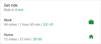 fun createSliceWithHeader(sliceUri: Uri) = list(context, sliceUri, ListBuilder.INFINITY) { setAccentColor(0xff0F9D) // Specify color for tinting icons header { title = "Get a ride" subtitle = "Ride in 4 min" summary = "Work in 1 hour 45 min | Home in 12 min" } row { title = "Home" subtitle = "12 miles | 12 min | $9.00" addEndItem( IconCompat.createWithResource(context, R.drawable.ic_home), ListBuilder.ICON_IMAGE ) } }