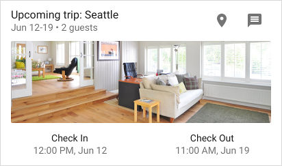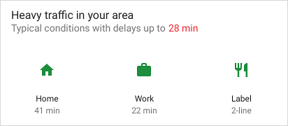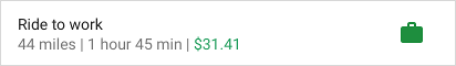 fun createSliceWithHeader(sliceUri: Uri) = list(context, sliceUri, ListBuilder.INFINITY) { setAccentColor(0xff0F9D) // Specify color for tinting icons header { title = "Get a ride" subtitle = "Ride in 4 min" summary = "Work in 1 hour 45 min | Home in 12 min" } row { title = "Home" subtitle = "12 miles | 12 min | $9.00" addEndItem( IconCompat.createWithResource(context, R.drawable.ic_home), ListBuilder.ICON_IMAGE ) } }