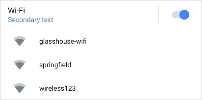 fun createActionWithActionInRow(sliceUri: Uri): Slice { // Primary action - open wifi settings. val wifiAction = SliceAction.create( wifiSettingsPendingIntent, IconCompat.createWithResource(context, R.drawable.ic_wifi), ICON_IMAGE, "Wi-Fi Settings" ) // Toggle action - toggle wifi. val toggleAction = SliceAction.createToggle( wifiTogglePendingIntent, "Toggle Wi-Fi", isConnected /* isChecked */ ) // Create the parent builder. return list(context, wifiUri, ListBuilder.INFINITY) { setAccentColor(0xff4285) // Specify color for tinting icons / controls. row { title = "Wi-Fi" primaryAction = wifiAction addEndItem(toggleAction) } } }