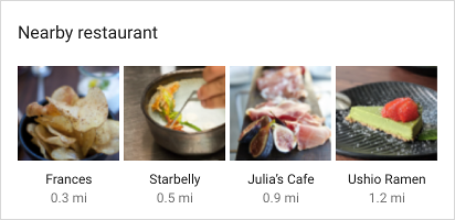 fun createSliceWithGridRow(sliceUri: Uri): Slice { // Create the parent builder. return list(context, sliceUri, ListBuilder.INFINITY) { header { title = "Famous restaurants" primaryAction = SliceAction.create( pendingIntent, icon, ListBuilder.ICON_IMAGE, "Famous restaurants" ) } gridRow { cell { addImage(image1, LARGE_IMAGE) addTitleText("Top Restaurant") addText("0.3 mil") contentIntent = intent1 } cell { addImage(image2, LARGE_IMAGE) addTitleText("Fast and Casual") addText("0.5 mil") contentIntent = intent2 } cell { addImage(image3, LARGE_IMAGE) addTitleText("Casual Diner") addText("0.9 mi") contentIntent = intent3 } cell { addImage(image4, LARGE_IMAGE) addTitleText("Ramen Spot") addText("1.2 mi") contentIntent = intent4 } } } }