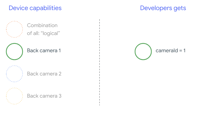 في معظم الحالات، تعرض الأجهزة التي تعمل بنظام التشغيل Android 9 والإصدارات الأحدث جميع الكاميرات (باستثناء أنواع أدوات الاستشعار الأقل شيوعًا مثل الأشعة تحت الحمراء) كاميرا منطقية أسهل في الاستخدام. لكل مجموعة من مجموعات البث يعمل الجهاز بشكل مضمون، ويمكن استبدال بث واحد تابع لكاميرا منطقية مصدري بث من الكاميرات المادية الأساسية.