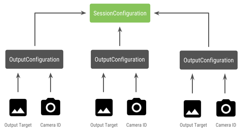 นอกจากการเลือกกล้องที่จะเปิดแล้ว กระบวนการจะเหมือนกับการเปิด กล้องใน Android เวอร์ชันก่อนหน้านี้ การสร้างเซสชันการจับภาพโดยใช้ การกำหนดค่าเซสชัน API จะบอกเฟรมเวิร์กให้เชื่อมโยงเป้าหมายบางอย่างกับ รหัสกล้องจริงที่เฉพาะเจาะจง: