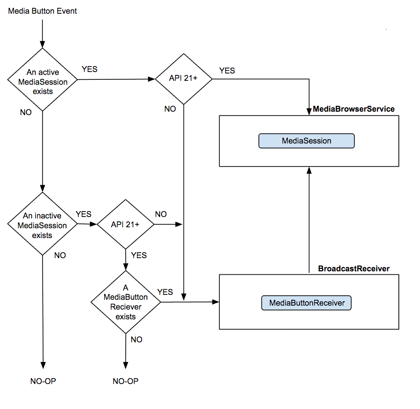 FLAG_HANDLES_MEDIA_BUTTONSMediaBrowserCompat.ConnectionCallback.onConnected. In questo modo chiama automaticamente il controllerdispatchMediaButtonEvent(), che traduce il codice chiave in un callback di sessione multimediale. - Prima di Android 5.0 (livello API 21), devi modificare