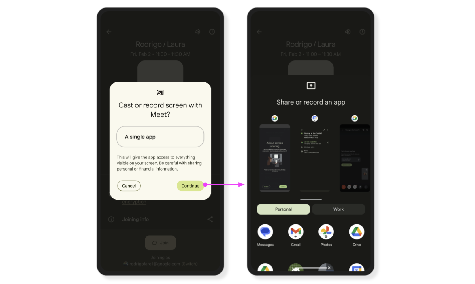 Od Androida 15 udostępnianie ekranu domyślnie obejmuje udostępnianie tylko jednej aplikacji. W razie potrzeby użytkownicy mogą zmienić to ustawienie, aby udostępnić cały ekran.