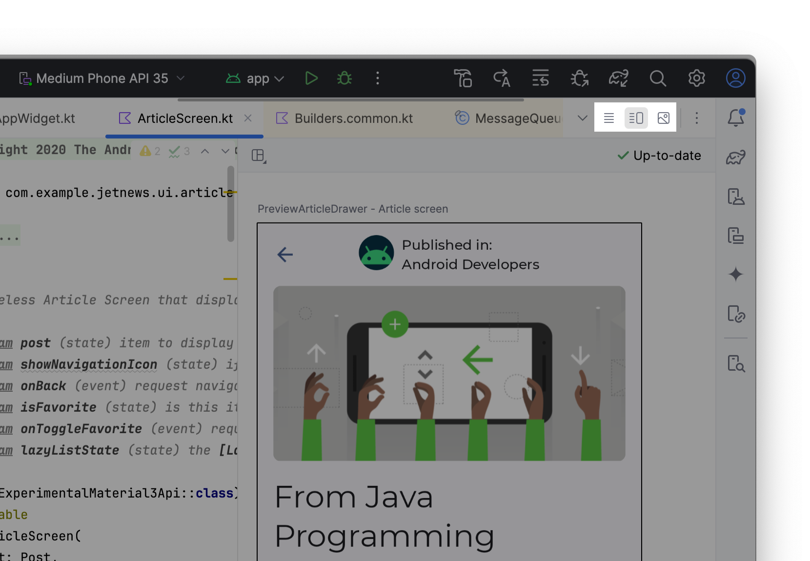 کنترل‌های ابزار رابط کاربری (کد/تقسیم/طراحی) برای پیش‌نمایش‌های Compose و View-based اکنون در خارج از برگه‌های ویرایشگر قرار دارند و دسترسی آسان‌تری را ارائه می‌دهند.