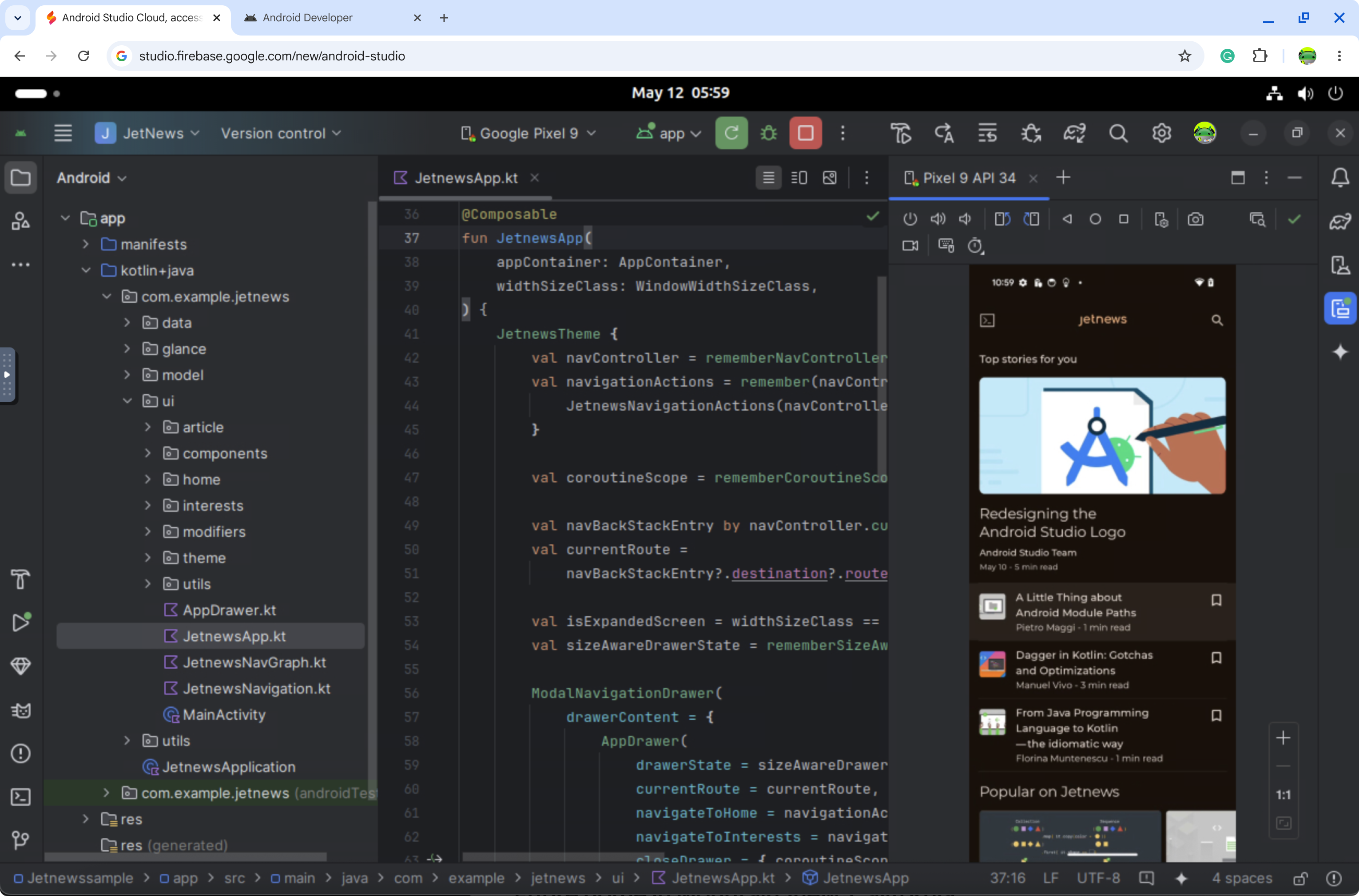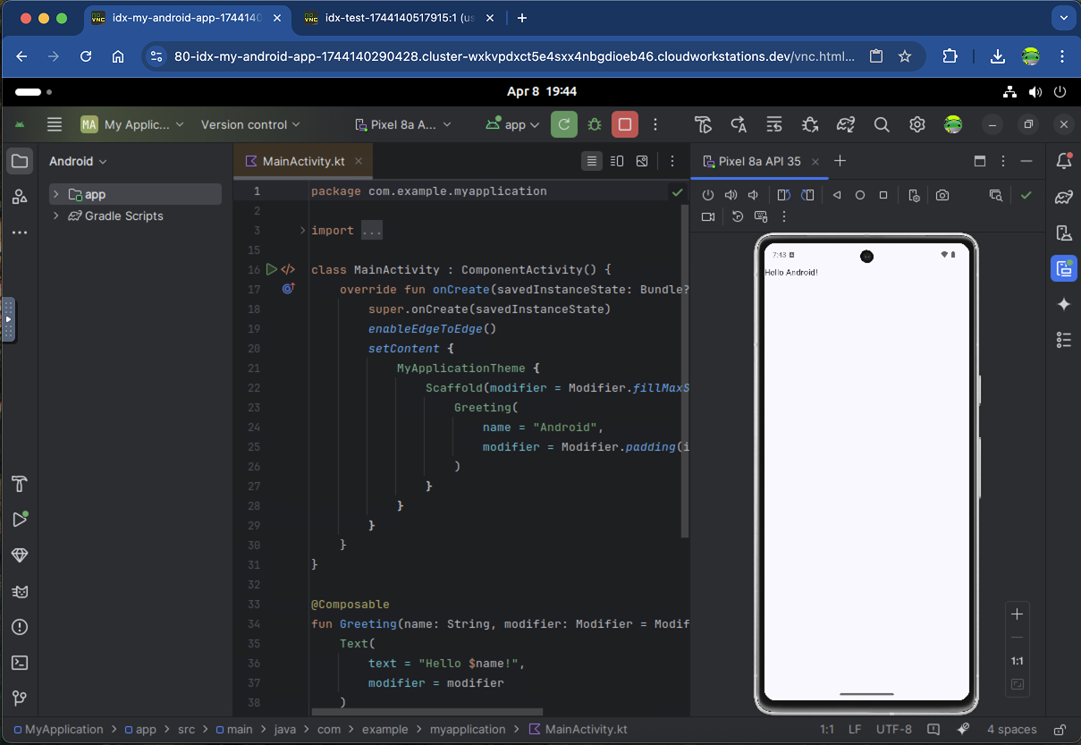 Android Studio Cloud, al que se accede a través de Firebase Studio, permite a los desarrolladores abrir proyectos de Android Studio de forma conveniente en cualquier lugar con conexión a Internet. Mientras experimentamos con tecnologías de transmisión, interactuarás con una máquina virtual (VM) de Linux transmitida de forma remota que ejecuta Android Studio en la Web. Se espera una experiencia del usuario similar a la de ejecutar la versión de Linux de Android Studio.