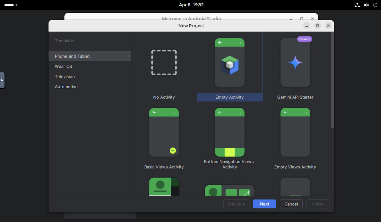 | Por ejemplo, puedes seleccionar New Project y abrir una Empty Activity. |