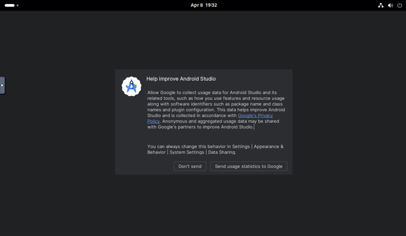 | Una vez cargado, accederás al entorno de Linux de la VM, donde se iniciará Android Studio. Elige si quieres enviar estadísticas a Google. |