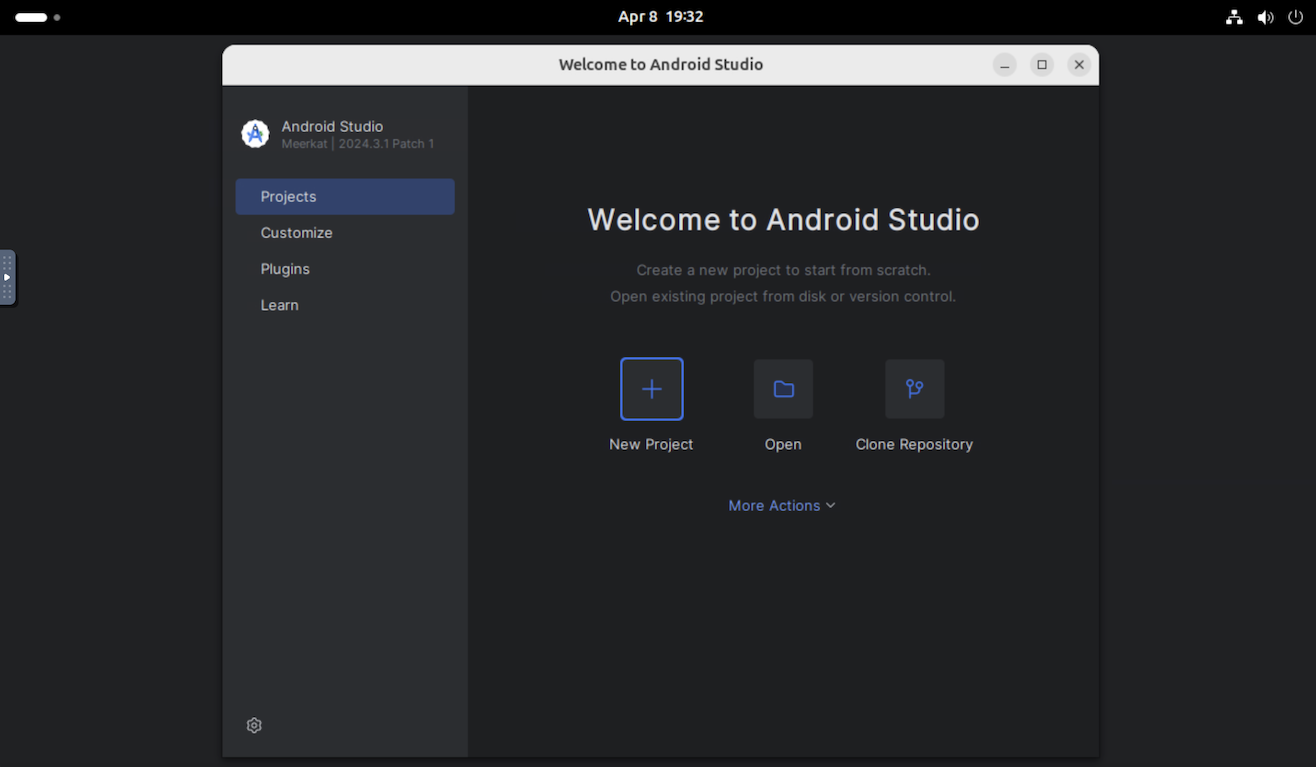 | Para iniciar un proyecto nuevo o abrir uno por primera vez, crea un New Project, Get from VCS o haz clic en More Actions y selecciona Import an Android Code Sample para comenzar con un proyecto de Android. |