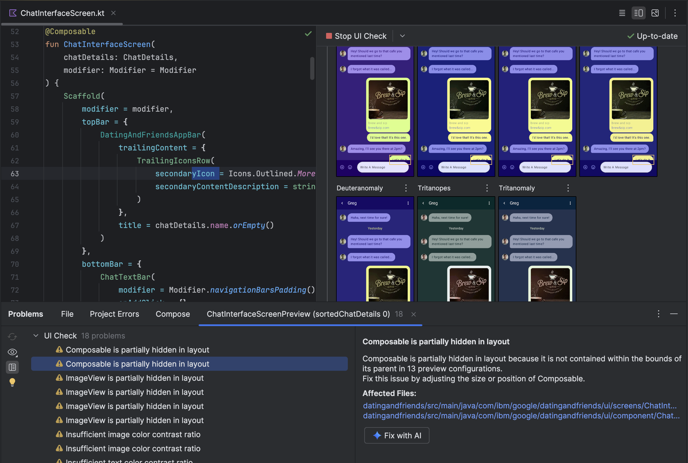 La verifica che la tua UI sia di alta qualità e più accessibile è un passaggio finale fondamentale. Azioni AI > Correggi tutti i problemi di controllo dell'interfaccia utente esegue l'audit dell'interfaccia utente per individuare problemi comuni, ad esempio quelli di accessibilità. L'agente proporrà e applicherà le correzioni per risolvere i problemi rilevati.