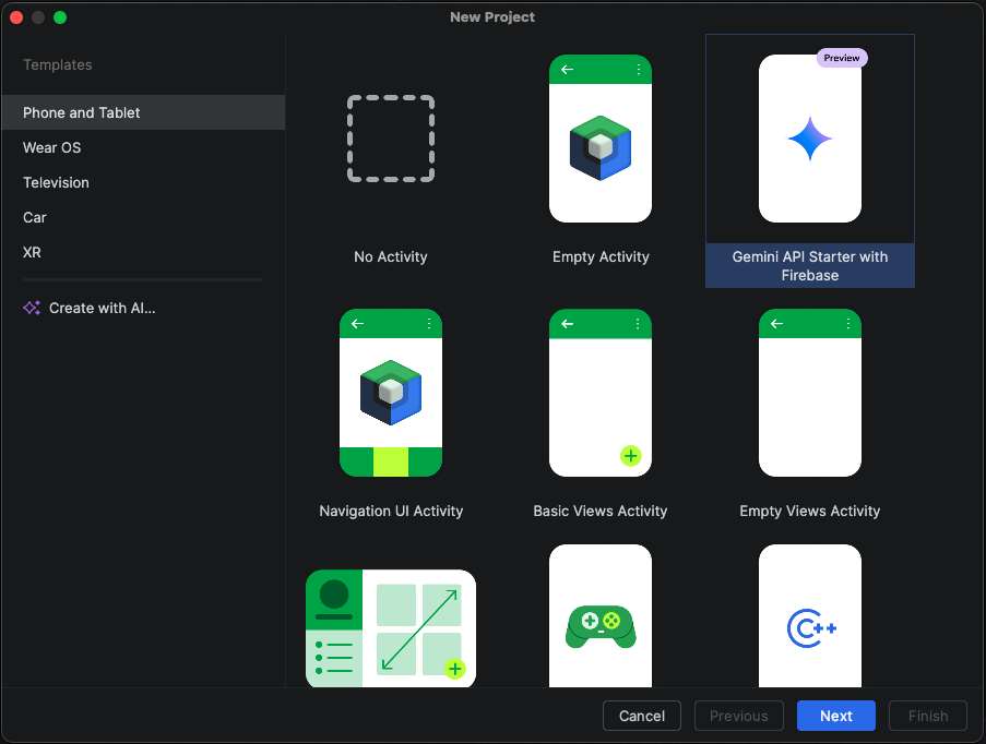 Для начала перейдите в меню Файл > Создать > Новый проект и выберите шаблон Gemini API Starter из списка доступных типов проектов.