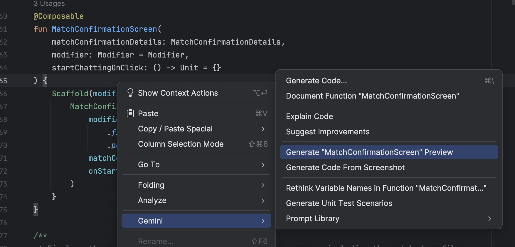 پیشنمایش Compose تولید کنید : این ویژگی اکنون توسط عامل Gemini بهبود یافته است تا نتایج دقیقتری ارائه دهد. هنگام کار در فایلی که دارای توابع Composable است اما حاشیهنویسیهای @Preview ندارد، میتوانید روی Composable کلیک راست کرده و Gemini > Generate [Composable name] Preview را انتخاب کنید. اکنون عامل، Composable شما را بهتر تجزیه و تحلیل میکند تا قالببندی لازم را با پارامترهای صحیح تولید کند تا به تأیید اضافه شدن پیشنمایش با موفقیت رندر شده کمک کند.