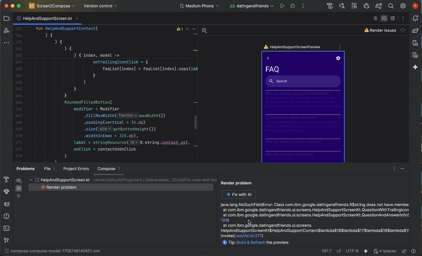 همچنین میتوانید با استفاده از دکمهی Fix with AI در حالت بررسی رابط کاربری نوشتن (Compose UI)، همین قابلیت را پیدا کنید:
