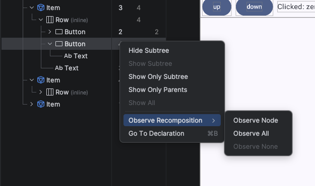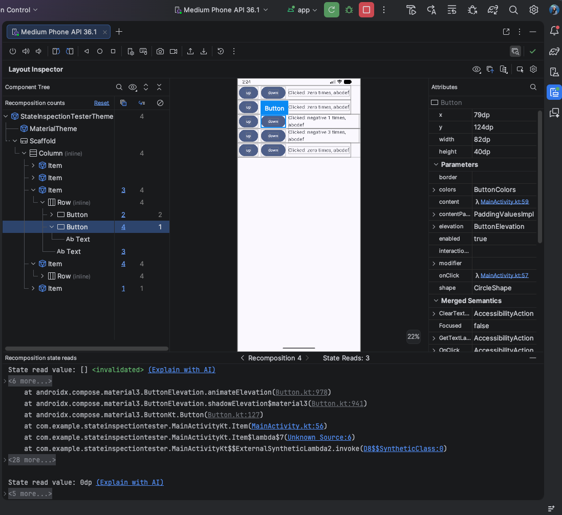 Layout Inspector'a recomposition durum okumaları ekleyerek yüksek recomposition sayılarını teşhis etmeyi kolaylaştırdık. Panda 3 canary'de kullanılabilen bu özellik, döngü sırasında gerçekleştirilen durum okumalarının ayrıntılı bir listesini sağlayarak yeniden oluşturmayı tetikleyen durum değişkenlerini belirlemenize yardımcı olur. Bu özelliği kullanmak için compose.ui:ui:1.10.0 (BOM 2025.12.01) veya sonraki bir sürümü kullanın.