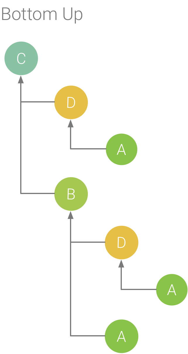 A guia Bottom Up mostra uma lista de chamadas em que a expansão de um nó do método ou da função exibe os autores da chamada. Usando o rastro de exemplo mostrado na Figura 2, a Figura 3 mostra uma árvore Bottom Up do método C. A abertura do nó para o método C na árvore Bottom Up mostra cada um dos autores da chamada exclusivos, os métodos B e D. Observe que, embora B chame C duas vezes, B é exibido apenas uma vez na expansão do nó para o método C na árvore Bottom Up. Depois disso, a expansão do nó B exibe os autores da chamada, os métodos A e D.