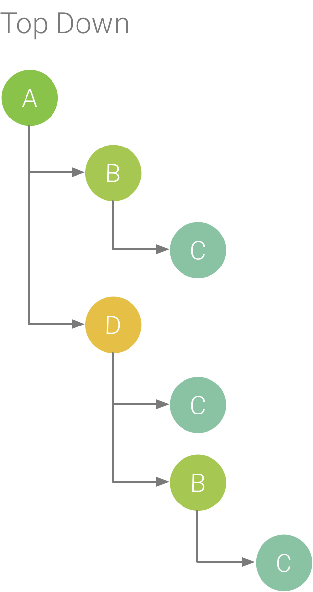 Como mostrado na Figura 2, a expansão do nó do método A na guia Top Down exibe os recebedores de chamada, os métodos B e D. Depois disso, a expansão do nó do método D expõe os recebedores da chamada, como os métodos B e C. De forma similar à guia Gráfico de chamas, a árvore de cima para baixo agrega informações de rastreamento para métodos idênticos que compartilham a mesma pilha de chamadas. Ou seja, a guia Flame Chart oferece uma representação gráfica da guia Top Down.
