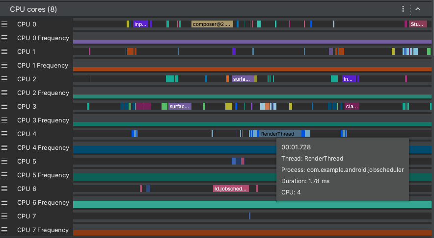 • Inti CPU: Menampilkan aktivitas di setiap inti pada perangkat Anda. Melihat aktivitas menurut inti dapat memberi Anda gambaran tentang inti mana yang merupakan inti"besar" atau "kecil" dalam prosesor seluler modern. Arahkan kursor ke aktivitas thread untuk melihat thread mana yang dijalankan inti ini pada waktu tertentu.
