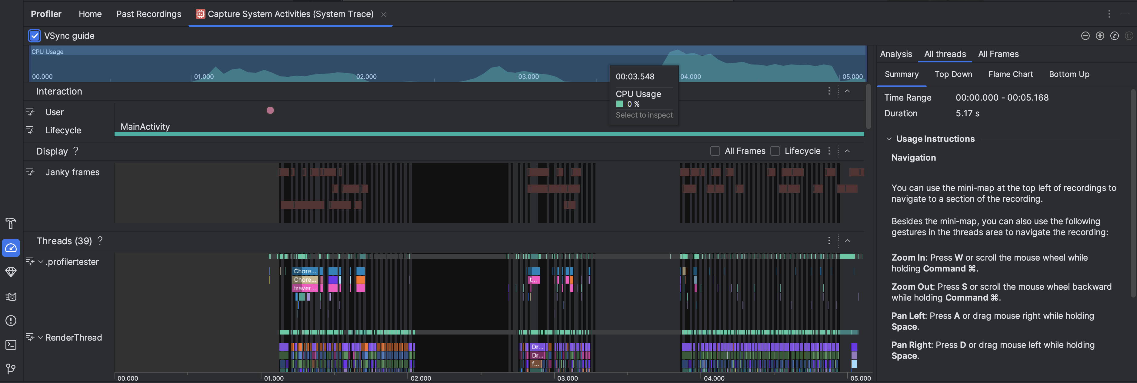 • Threads: Menampilkan thread yang dijalankan aplikasi Anda dan berbagai proses sistem. Untuk mempelajari cara menggunakan rekaman aktivitas sistem guna menyelidiki dan membantu mengurangi jank UI, lihat Mendeteksi jank UI.