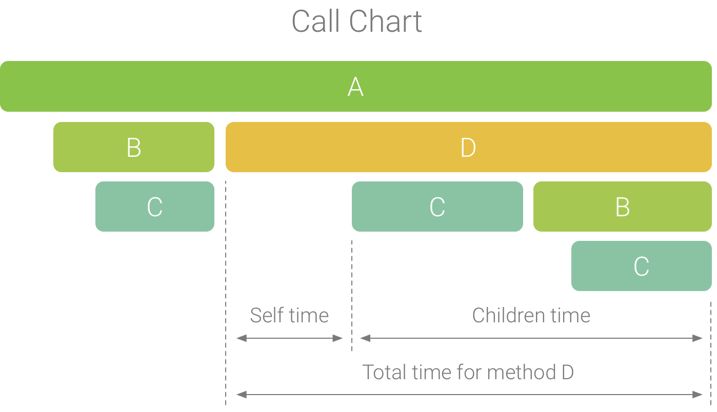 - Total: Es la suma de los tiempos Self y Children del método (representa el tiempo total que la app tardó en ejecutar una llamada, como se ilustra en la Figura 1 para el método D).