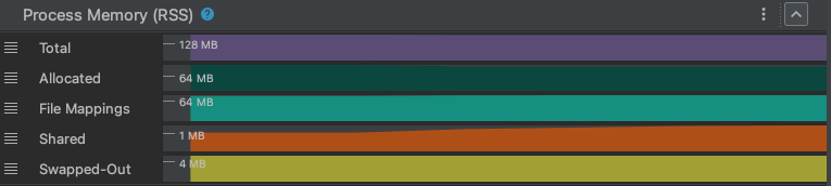 En el caso de las apps implementadas en dispositivos con Android 9 o versiones posteriores, en la sección de memoria de proceso (RSS), se muestra la cantidad de memoria física que la app usa en ese momento.