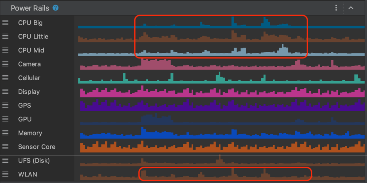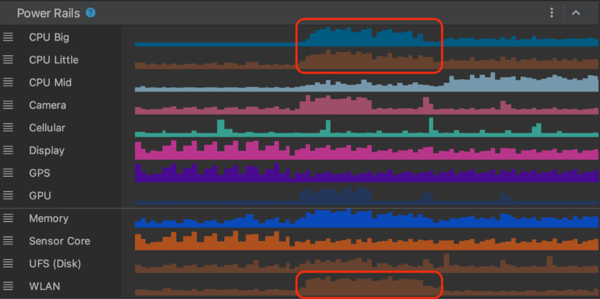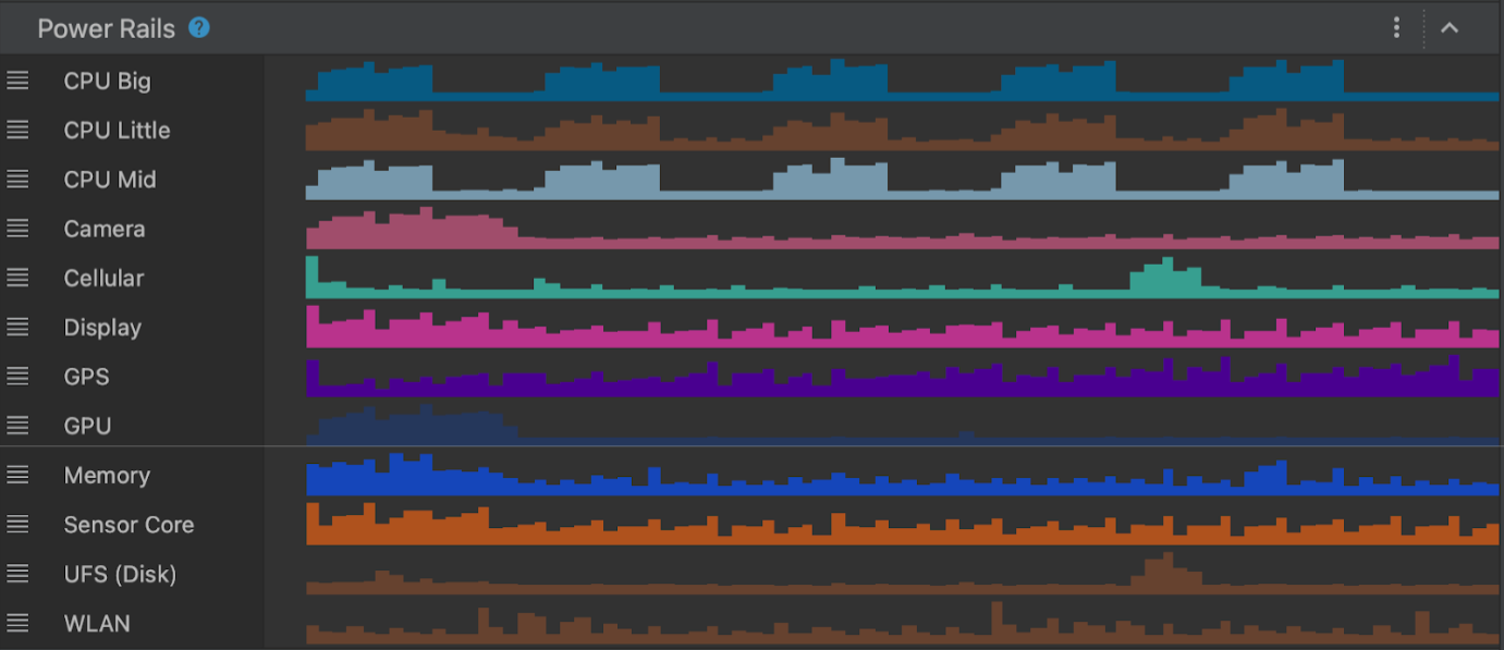 A partir de Android Studio Hedgehog, el Generador de perfiles de energía muestra el consumo de energía en los dispositivos. Puedes ver estos datos nuevos en el monitor de rieles de energía integrado en el dispositivo (ODPM). Segmenta la información según los subsistemas llamados "Rieles de energía". Consulta los rieles de energía perfilables para obtener una lista de los subsistemas compatibles.