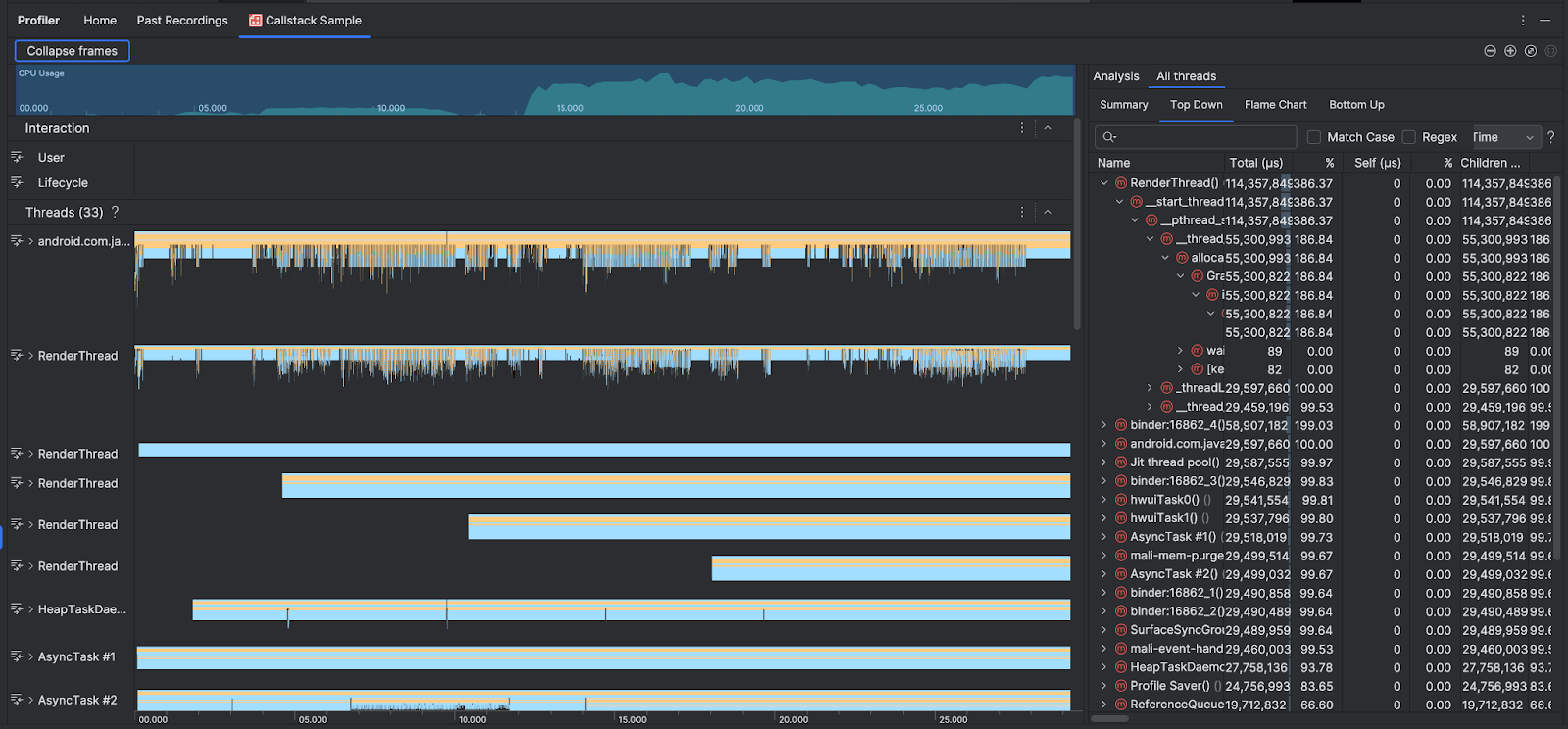 Para complementar as linhas do tempo de uso da CPU e interações, a seção Linhas de execução mostra frames para cada chamada feita pelo app e pelo sistema. Confira algumas dicas para navegar pela amostra de callstack: