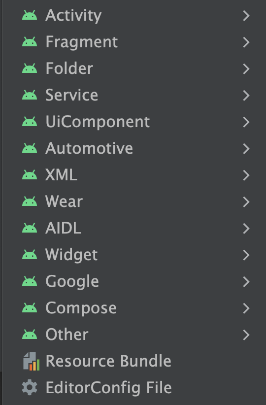 Además de las actividades, también puedes agregar otros componentes de proyecto de Android a una app existente con plantillas. En estas plantillas, se incluyen componentes de código, como servicios y fragmentos, y componentes sin código, como carpetas y archivos XML.