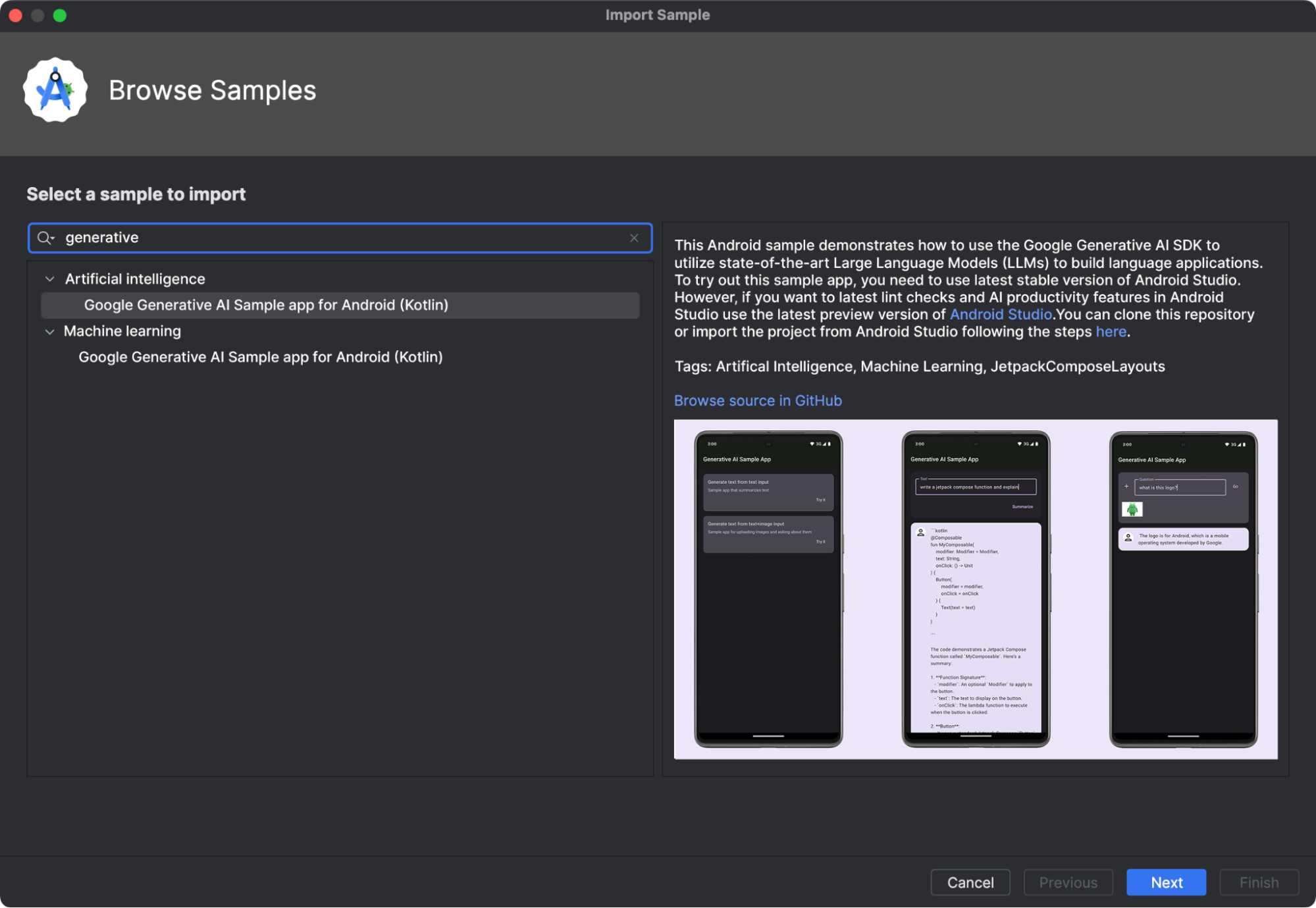 Pelajari lebih lanjut Google AI SDK untuk Android dengan meninjau panduan memulai cepat Google AI SDK untuk Android. Untuk mendapatkan lebih banyak contoh kode, Anda dapat mengimpor contoh kode Generative AI ke Android Studio melalui File > New > Import Sample dan menelusuri Generative AI Sample.