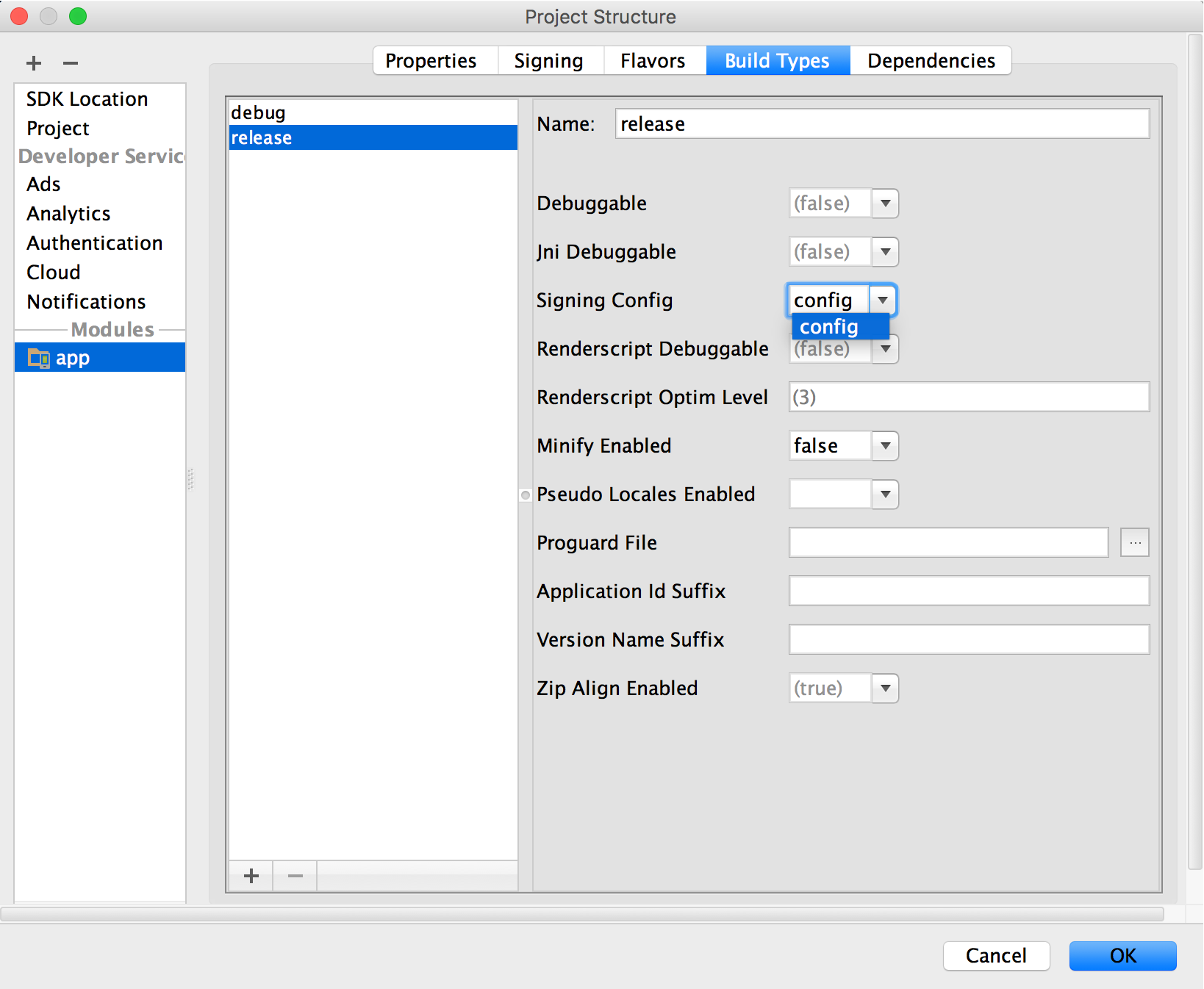 - یک پیکربندی امضا ایجاد کنید و آن را به یک یا چند نوع ساخت اختصاص دهید. این دستورالعملها فرض میکنند که شما یک پیکربندی امضای واحد را برای نوع ساخت نسخه خود پیکربندی کردهاید، همانطور که در بالا توضیح داده شده است.