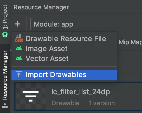 Além desses recursos, o Resource Manager oferece uma maneira de importar drawables em massa para o projeto. Para fazer uma importação em massa, você tem as seguintes opções: