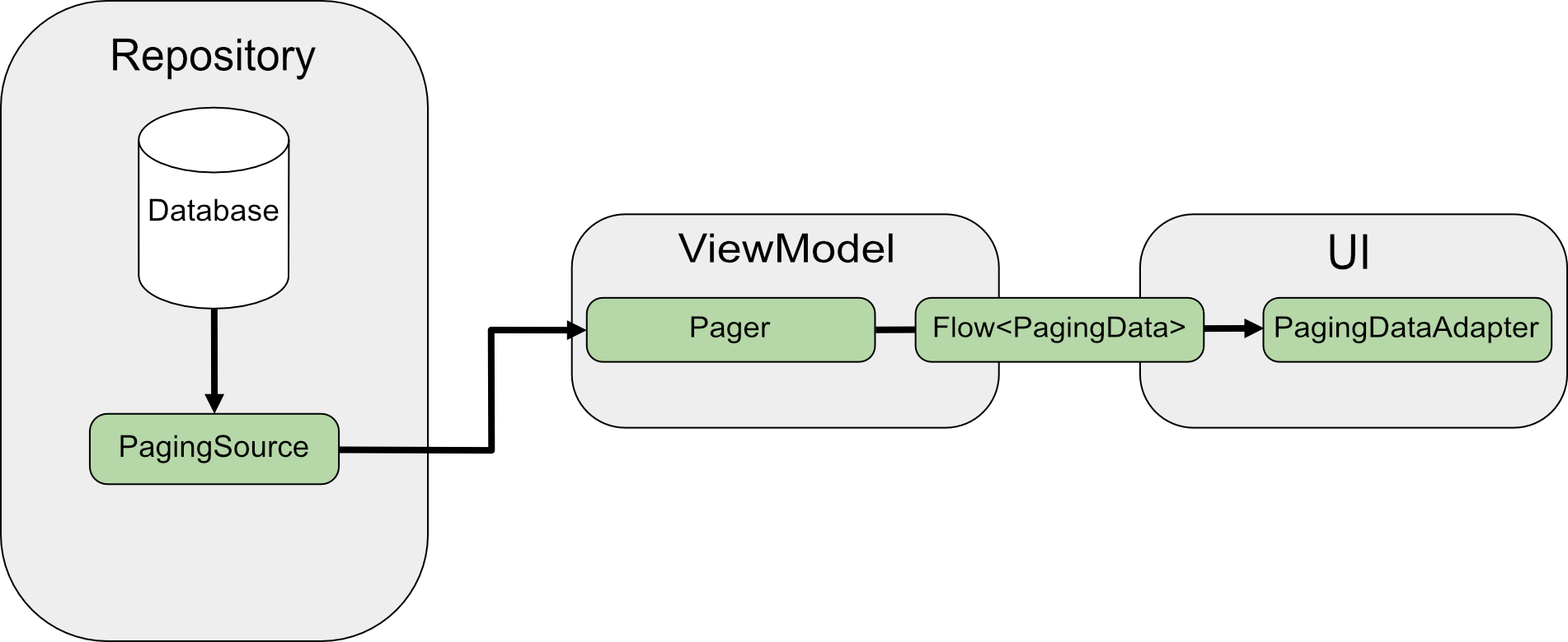 כשנדרשים נתונים חדשים בממשק המשתמש, הפונקציה Pager קוראת לשיטה load() מתוך PagingSource ומחזירה זרם של אובייקטים PagingData שמכילים את הנתונים החדשים. כל אובייקט PagingData בדרך כלל נשמר במטמון ב-ViewModel לפני שהוא נשלח לממשק המשתמש לתצוגה.