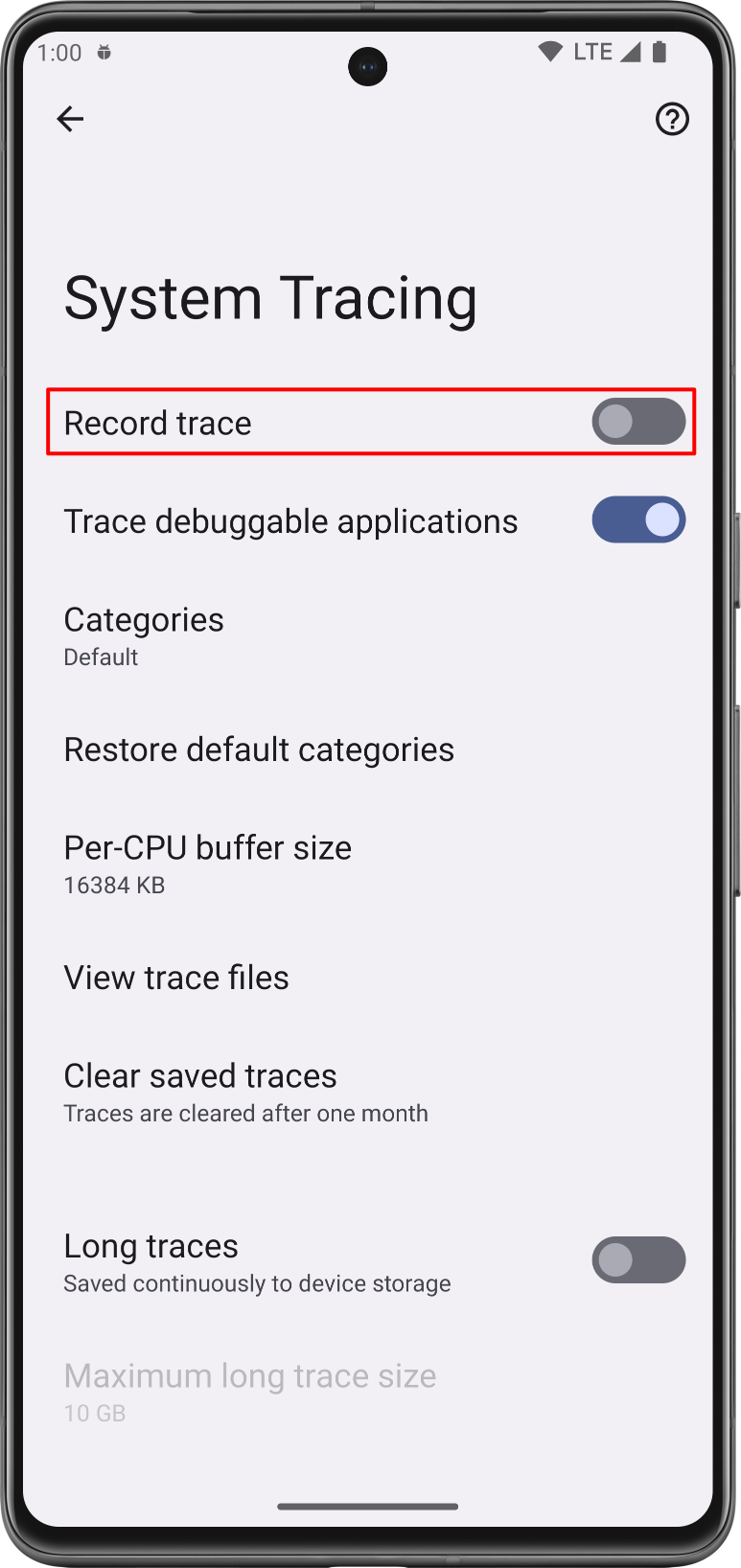 É possível selecionar rastros longos para ativar rastros que são salvos continuamente no armazenamento do dispositivo. Para essa opção, defina limites para o Tamanho máximo do rastro longo e a Duração máxima do rastro longo.