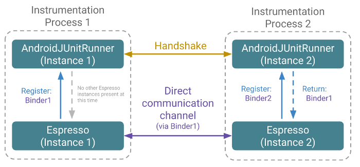 AndroidJUnitRunnerعملية تبادل تأكيد الاتصال لإنشاء اتصال بينهما. في الوقت نفسه، يربط كل مثيل منAndroidJUnitRunnerجميع العملاء المسجّلين، مثل Espresso، بنظرائهم في العمليات الأخرى، ما يتيح لهؤلاء العملاء إنشاء قناة اتصال مباشرة بينهم. - يستمر كل