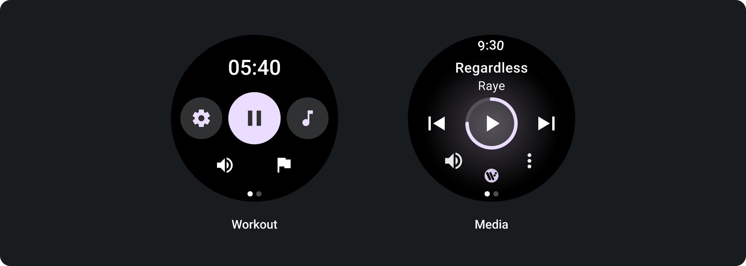 ในจอแสดงผลทรงกลม ตัวบ่งชี้หน้าเว็บจะเป็นทรงโค้ง ลักษณะการทำงานนี้ใช้ในคลาส HorizontalPageIndicator ประกอบด้วยตัวบ่งชี้ที่ใช้งานอยู่ 1 รายการและตัวบ่งชี้ที่ไม่ได้ใช้งานอย่างน้อย 1 รายการ