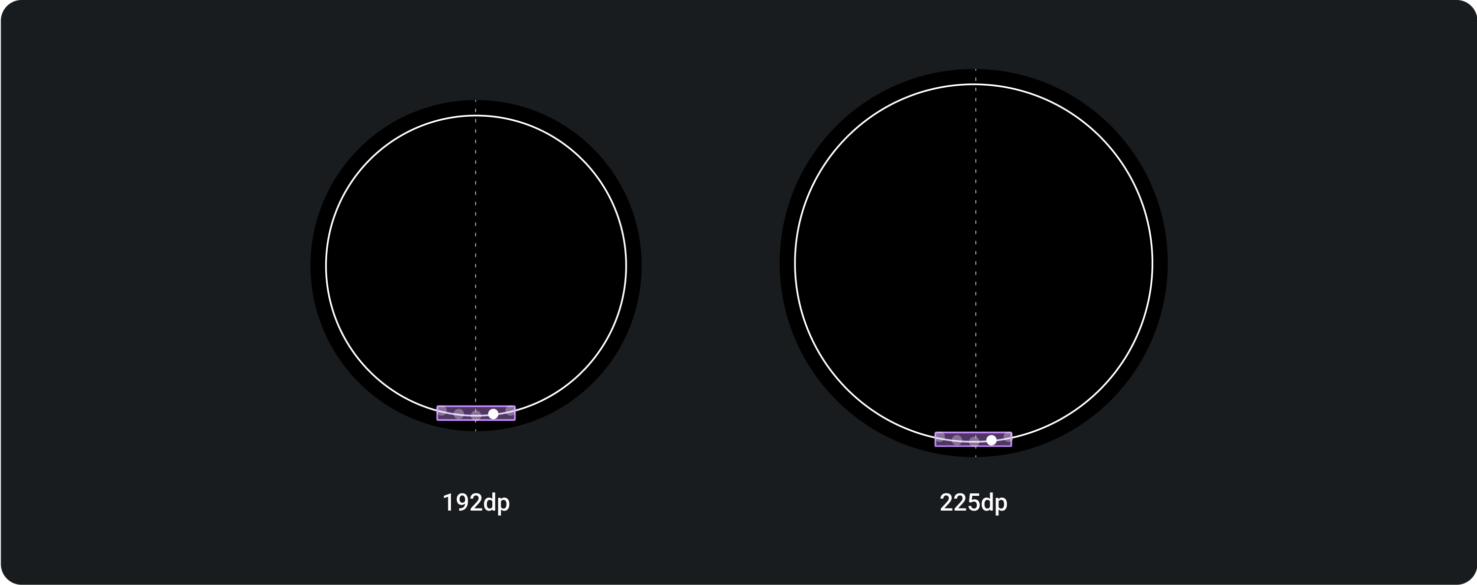 ศูนย์กลางของเส้นรอบวงจุด (ตัวบ่งชี้) อยู่ใกล้หรือบนตารางกริดวงกลมเพื่อความสมดุลของภาพ ซึ่งหมายความว่ามุมโค้งจะเปลี่ยนไปเล็กน้อยเมื่อขนาดหน้าจอเพิ่มขึ้น