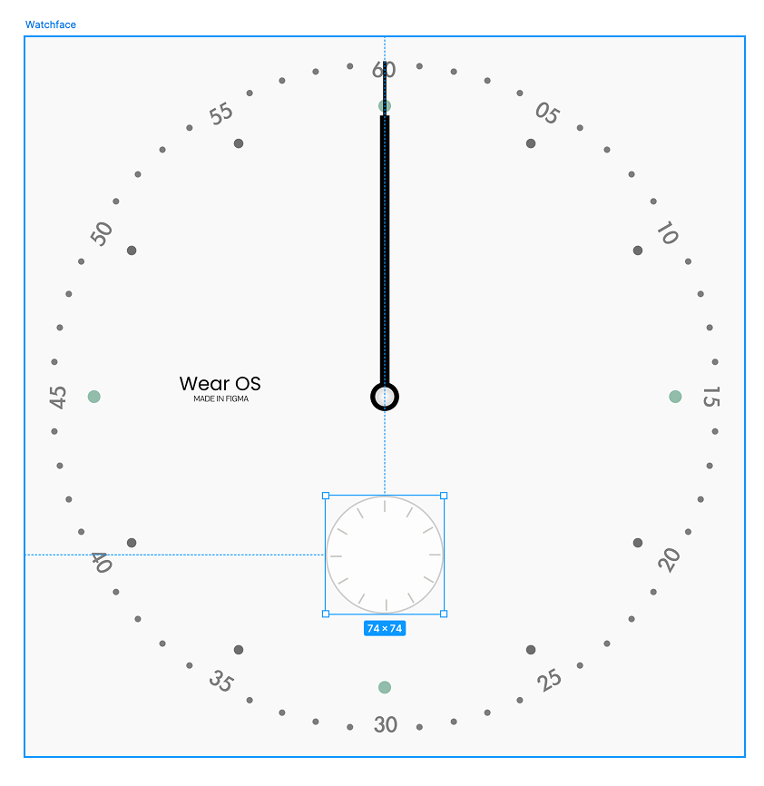 Figura 2: Diseño de segunda mano dentro de un marco contenedor Selecciona el marco del subdial que contiene la manecilla de los segundos. Luego, en Watch Face Designer, configura Rotate around como "Layer center":