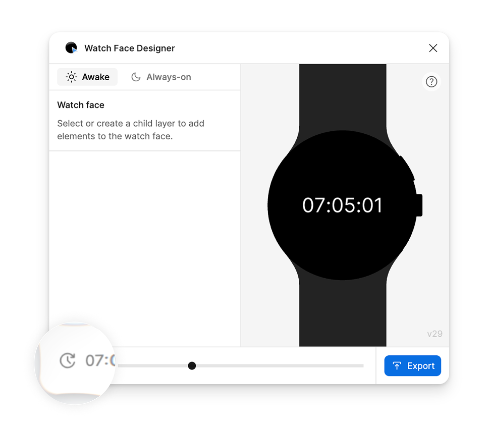 Para obtener una vista previa de la cara de reloj en un dispositivo físico, consulta la guía de exportaciones.