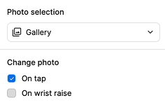 Jika Pemilihan foto disetel ke "Galeri", pengguna dapat memilih beberapa foto untuk slot ini, dan smartwatch akan menampilkannya secara bergantian di berbagai titik, bergantung pada pilihan Anda di bagian "Ubah foto:"