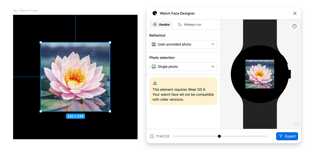 Untuk mendukung foto kustom, tambahkan lapisan ke tampilan jam, dan tetapkan Perilaku ke "Foto yang disediakan pengguna". Untuk contoh ini, kita menggunakan contoh foto bunga sebagai gambar default untuk lapisan ini. Gambar ini digunakan sebagai pengganti sebelum pengguna menetapkan fotonya sendiri, atau saat pengguna memilih untuk tidak menggunakan salah satu fotonya.