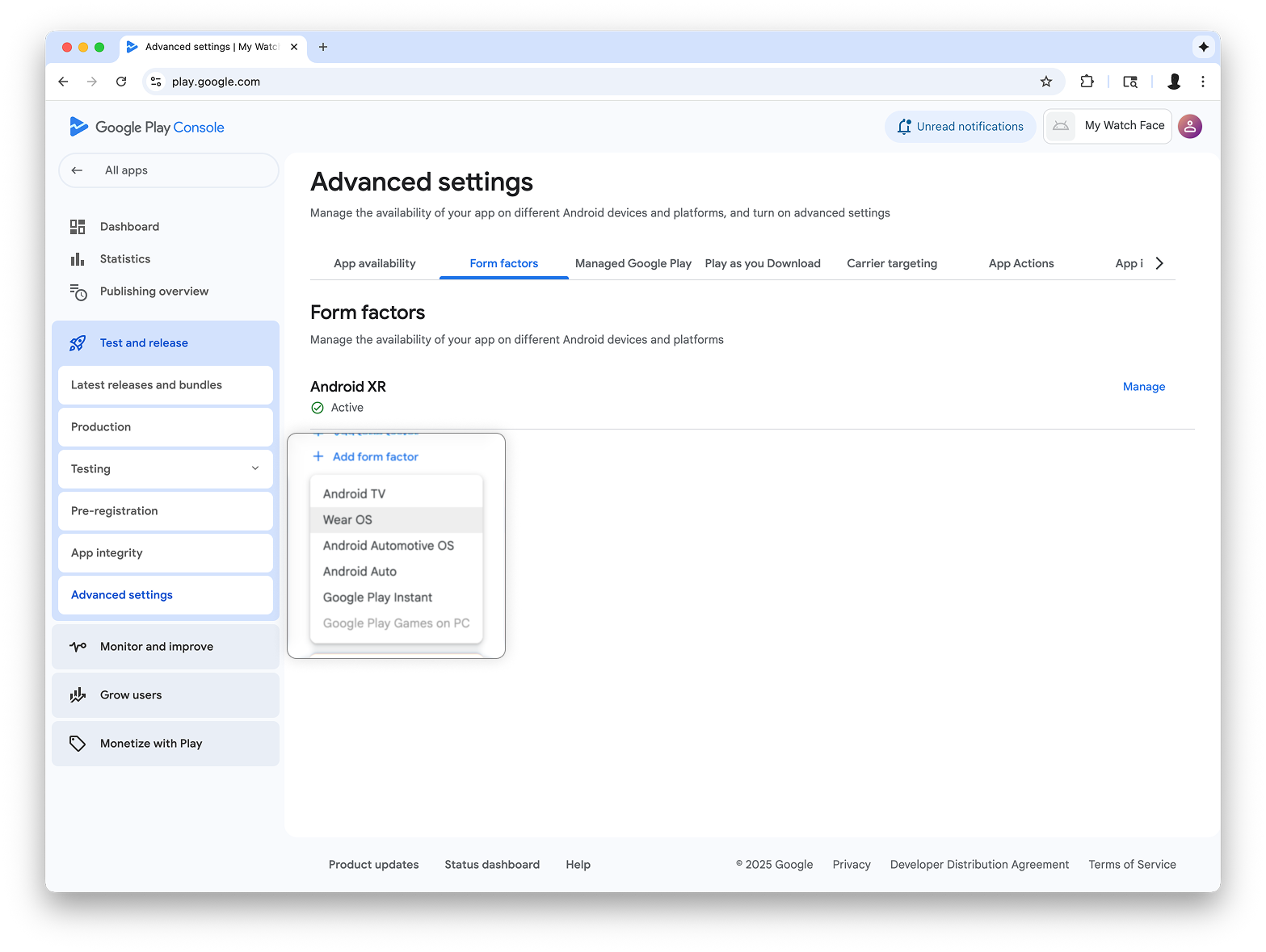 En el menú desplegable de la parte superior derecha de la página, selecciona Administrar factores de forma y agrega Wear OS como factor de forma para tu app: